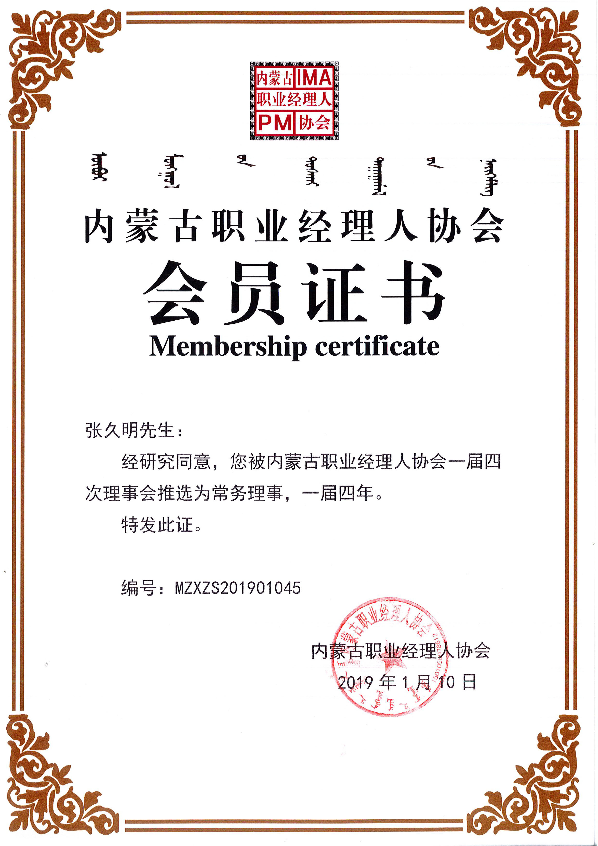 內蒙古職業經理人協會會員證書