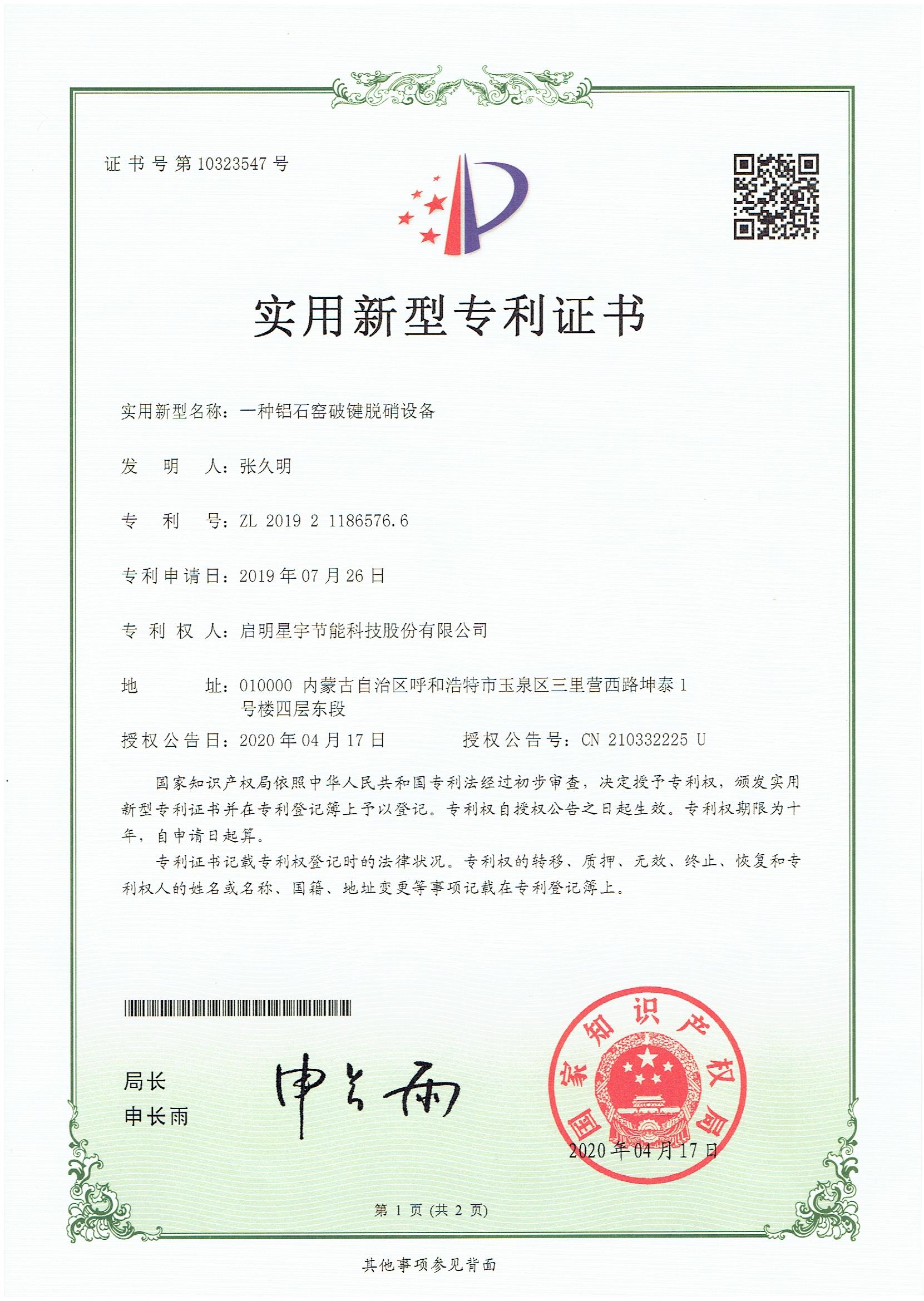 一種鋁石窯破鍵脫硝設備實用新型專利